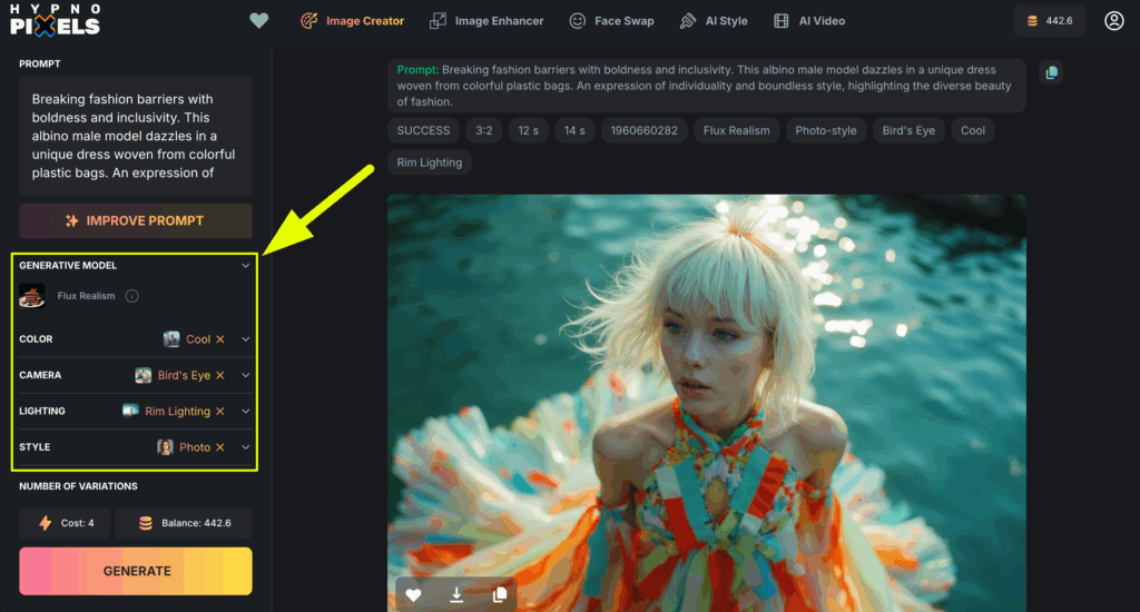 You can also use Hypnopixels’ built-in AI buddy to modify your prompt and make it more effective. Plus, it offers a wide range of image customization options like style, lighting, camera angle, color scheme, and picture size.